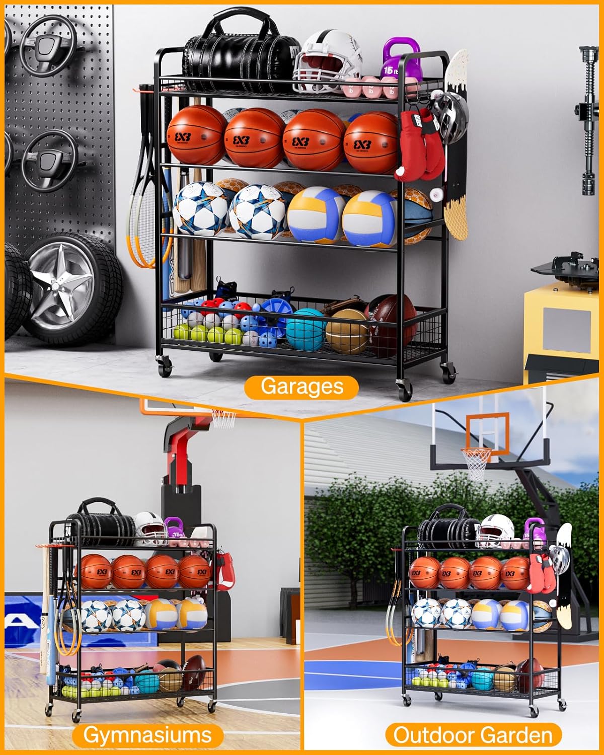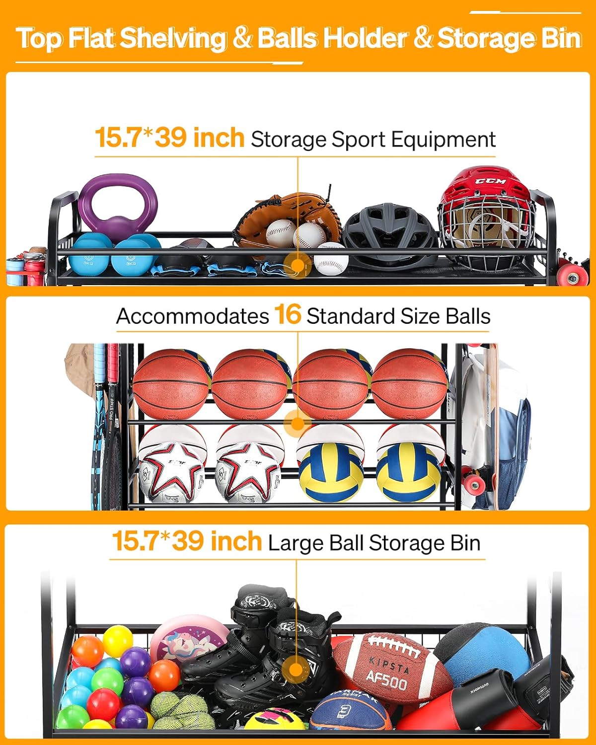 LARGE ORGANIZER CAPACITY : The unique 4-layer design allows product to accommodate a greater quantity of sports gear. 15.7*39 inch Top Flat Shelving & 2 Layers 4 Balls Holder Pipe & 15.7*39 inch Ball Storage Bin & Side Hooks (9 Straight Hooks+ 5 Bent Hooks), ensuring your sports equipment is neatly stored with ease.