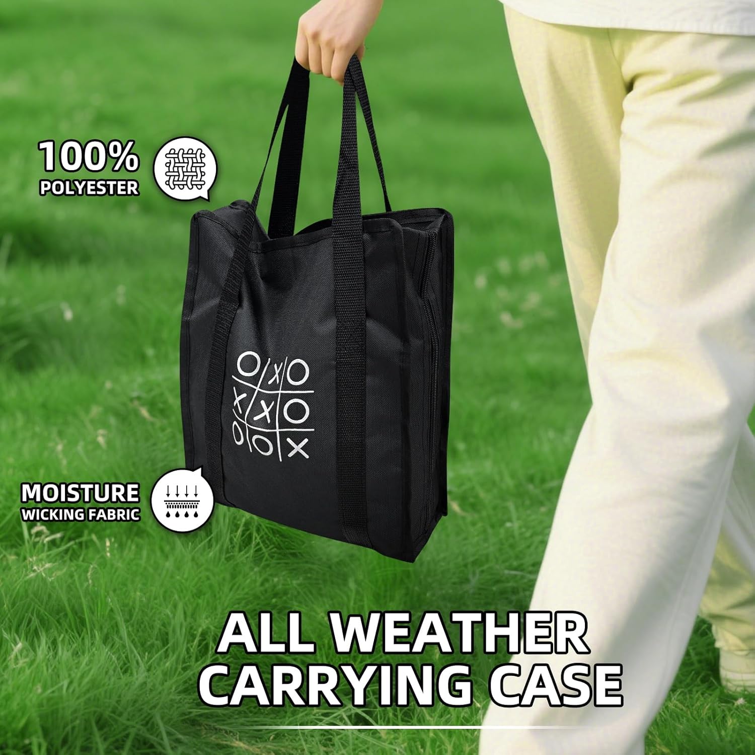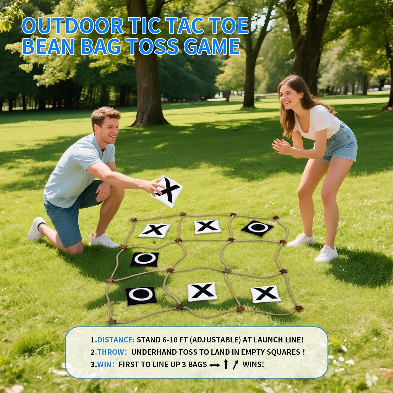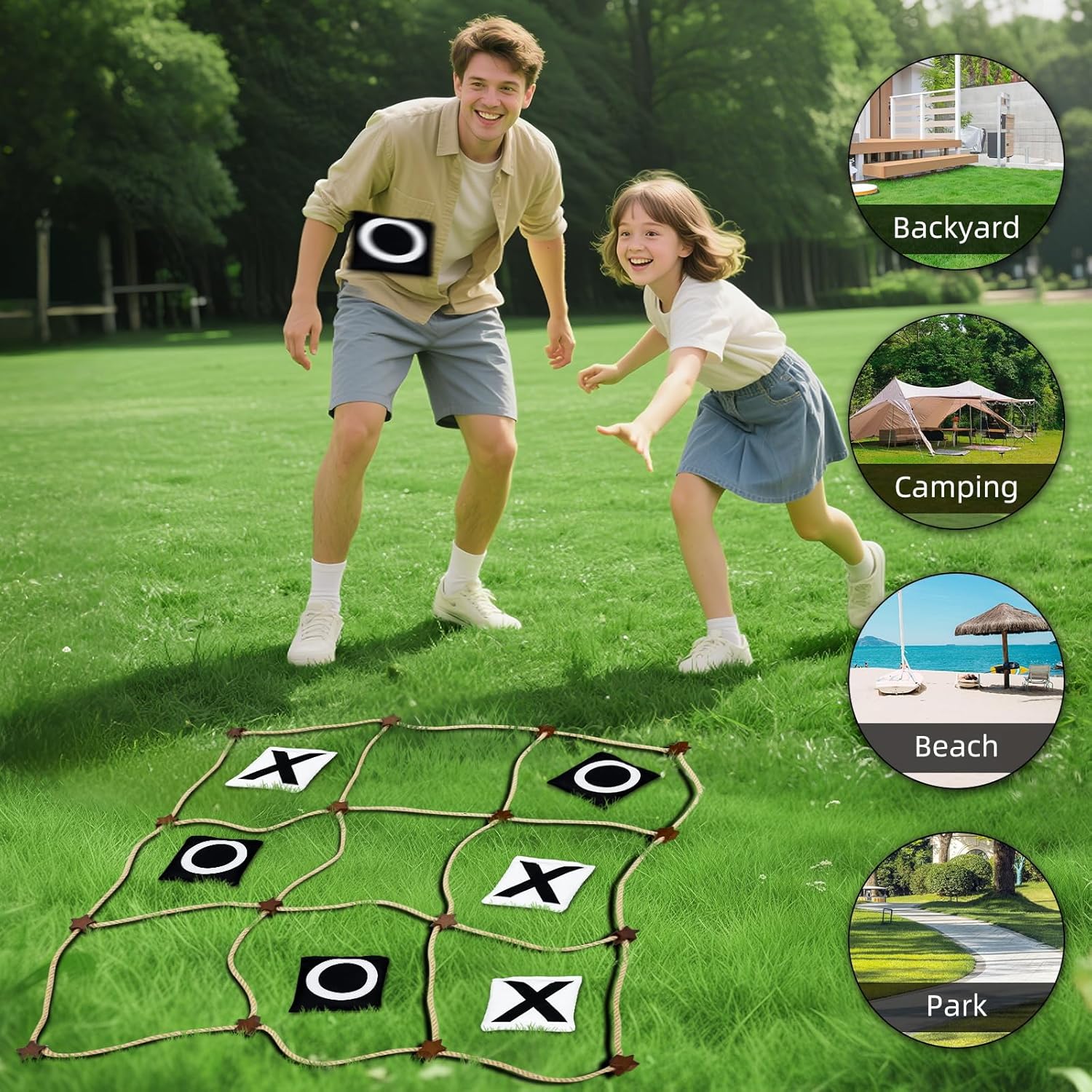 【Giant 3ft x3ft Toss Game】Built with 0.67-inch reinforced ropes and 0.44-oz weighted bean bags (5 X’s & 5 O’s) for stability during intense play. The giant grid withstands energetic tosses on grass, sand, or indoor floors, secured by 6 included ground stakes.
