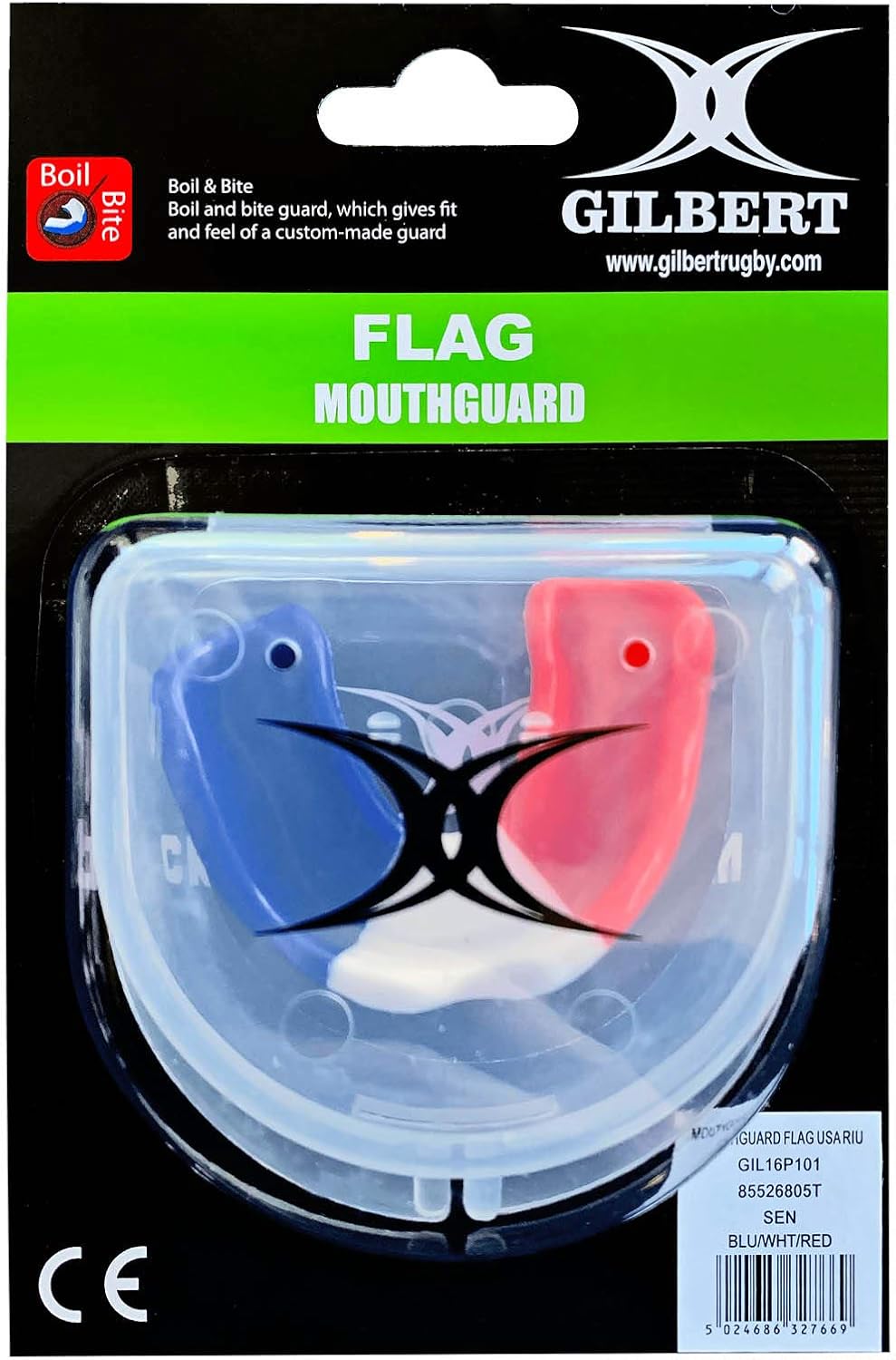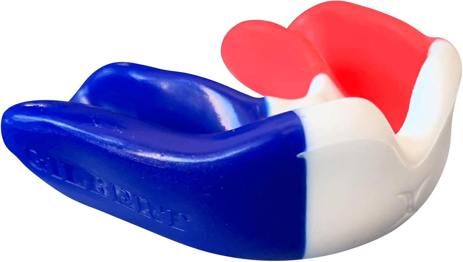 Gilbert’s academy mouthguard, with a USA stars and stripes style. This superior entry-level mouthguard offers a pre-contoured shield and extra wall thickness.