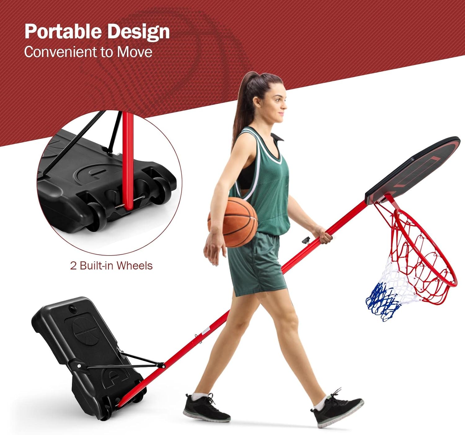 šćPortable Basketball HoopćConsidering your convenience, this high quality basketball hoop and goal system is equipped with 2 built-in wheels for labor-saving transportation. Hence, you can move it no matter whether indoor or outdoor with ease, meeting your different needs.