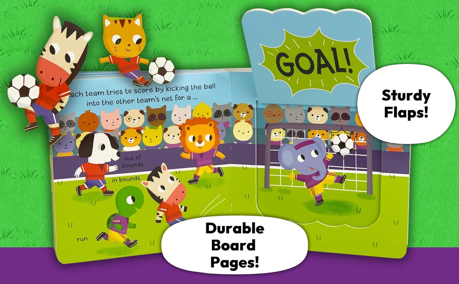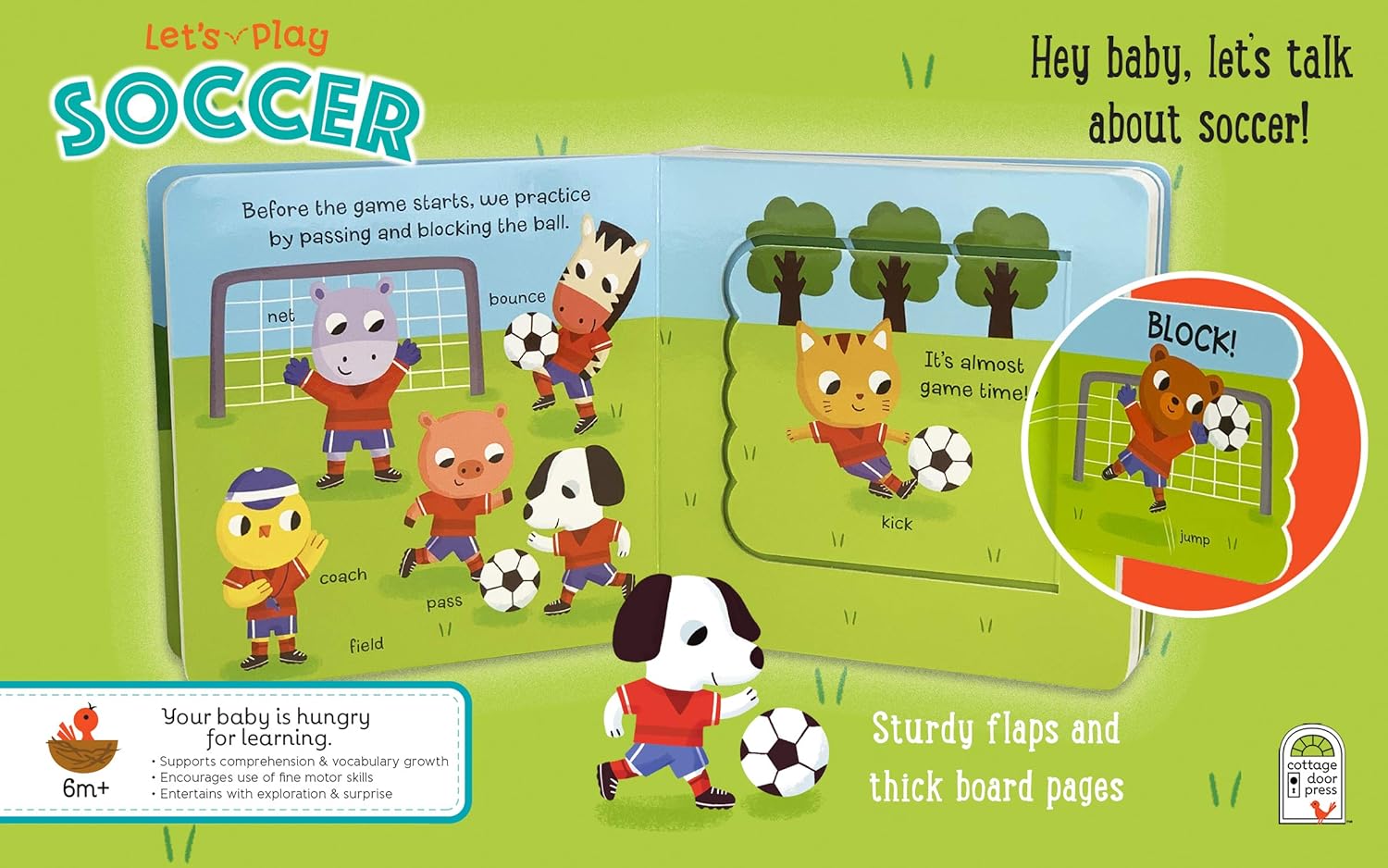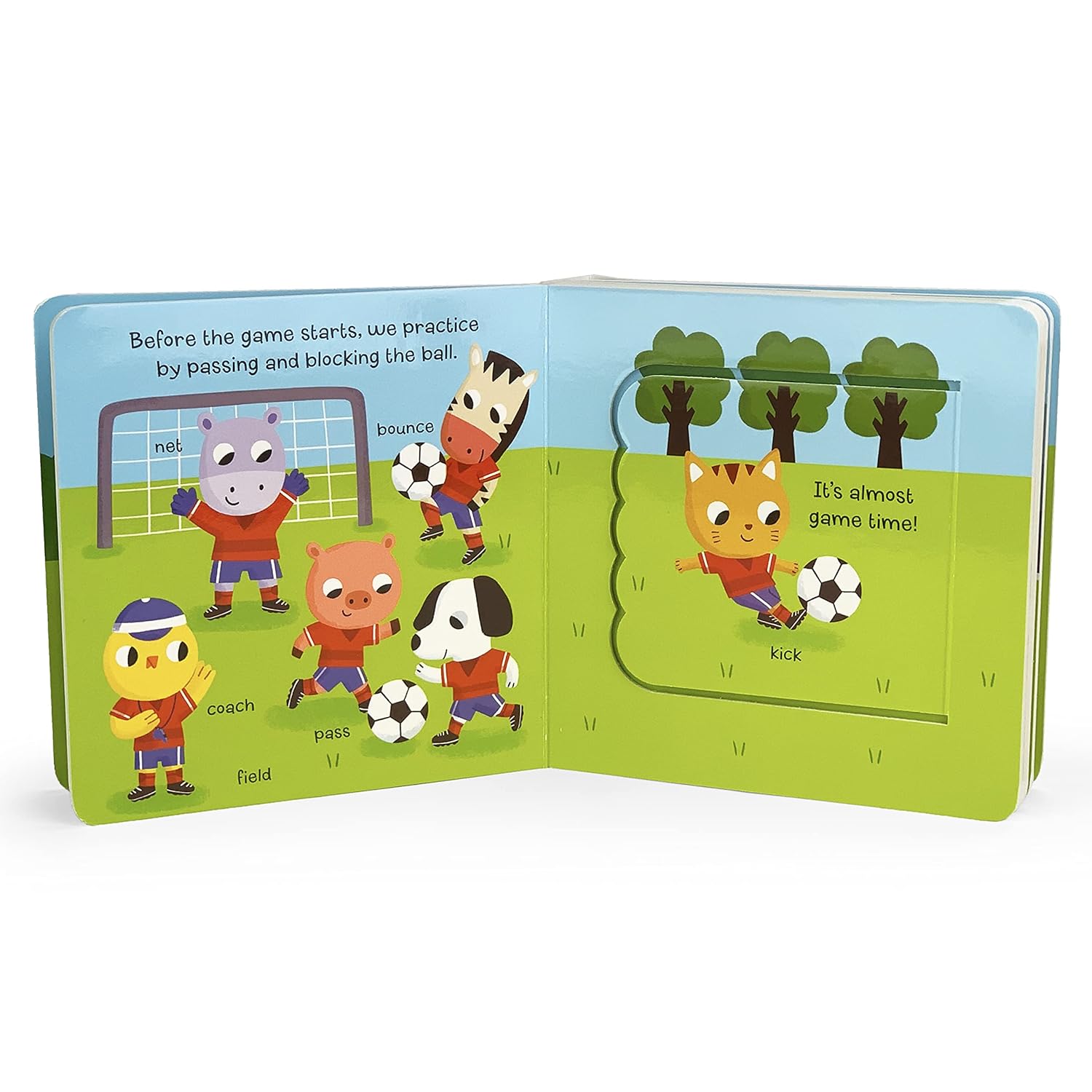 Gooooooal! Introduce your little one to the great sport of soccer in this lively, interactive Lift-a-Flap board book. Learn all about basic game rules, team uniforms, safety equipment, practice drills, and good sportsmanship. Babies and toddlers will love exploring every playful scene filled with animal friends and tons of soccer fun. Thick, durable board pages and easy-to-lift chunky flaps are perfectly sized for little hands and fingers to turn and read along during story time. Count the number of players on the field and practice words such as coach, pass, catch, kick, ball, and goal. Most importantly, learn how to be a kind player by shaking hands at the end of the game. A perfect first book for your budding little athlete!