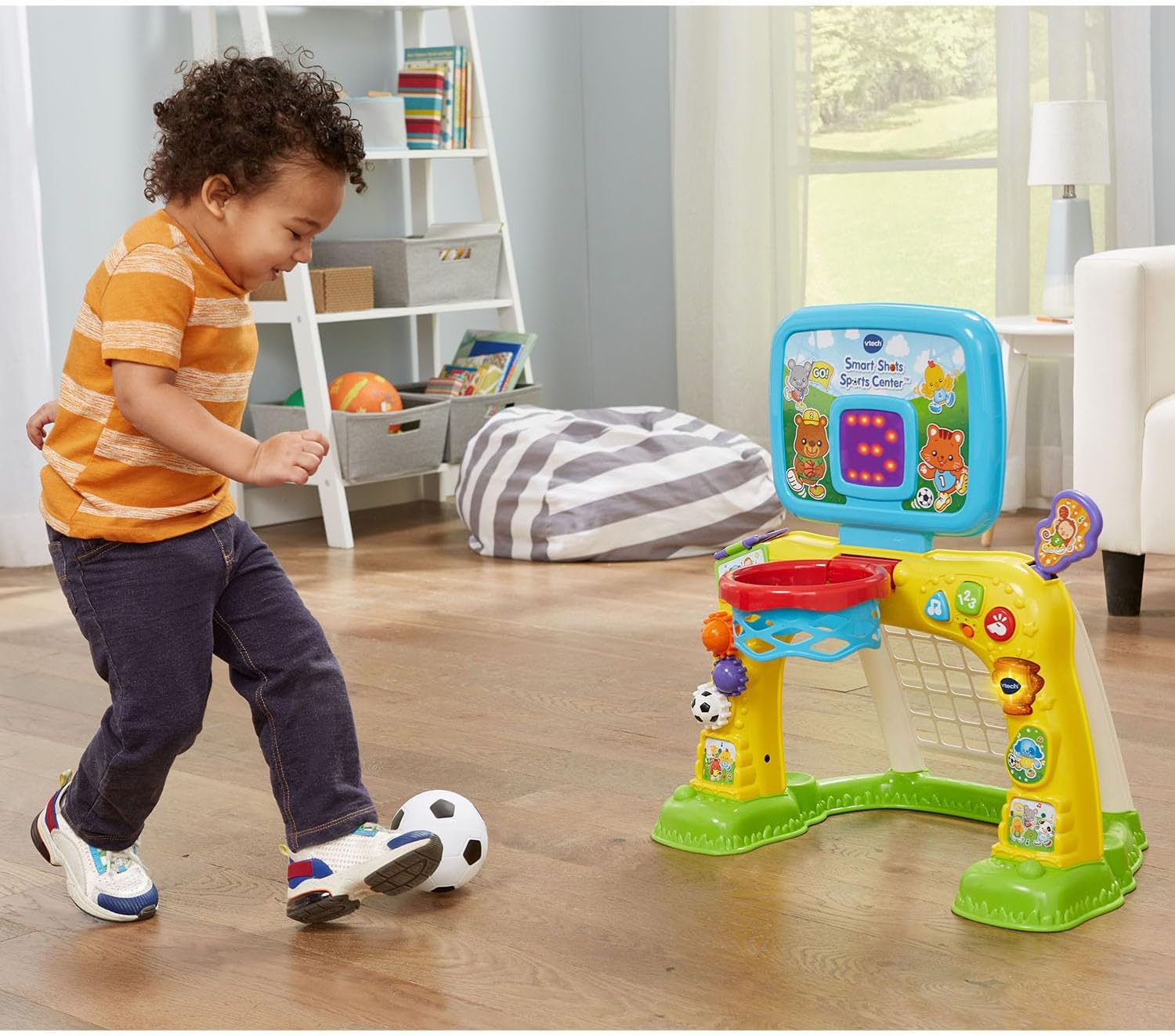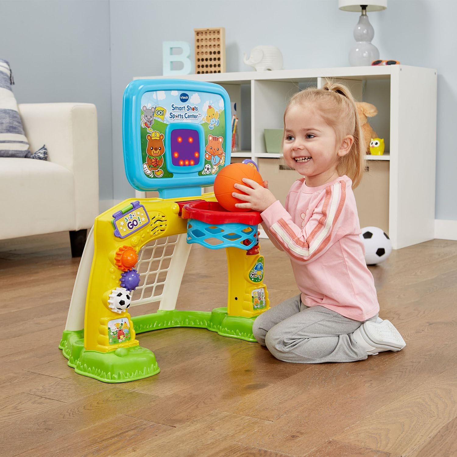 Encourage little athletes with this electronic sports center that features a soccer net and basketball hoop. Toss the basketball into the hoop and cheer as the LED screen counts the number of baskets made. Kick the soccer ball into the net and the sports center will celebrate with exciting sounds and phrases. As well as counting baskets, the backboard plays fun animations to keep toddlers engaged. Turn the gears to hear sound effects and work out little fingers, or press the shape buttons to explore shapes, numbers and fun sounds. Let the games begin! Intended for ages 12-36 months. Requires 3 AA batteries. Batteries not included. New batteries recommended for regular use.